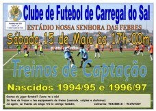 TREINOS DE CAPTAÇÃO "CLUBE DE FUTEBOL DE CARREGAL DO SAL" Marco 23:25 Marco Nasceste em 1994/95 e 1996/97 e gostas de jogar tutebol, pede aos teus Pais para te levarem ao Estadio Nossa Senhora das Febres em Carregal do Sal no dia 15 de Maio (Sàbado) pelas 17:00 horas para um treino de captação. Tweet Partilhar Partilhar Partilhar Partilhar Artigos Relacionados