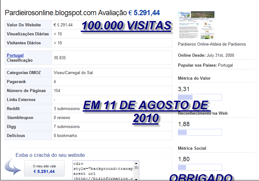 E com um enorme prazer e honra que o PARDIEIROS-ONLINE, hoje dia11 de Agosto de 2010 ultrapassou a marca dos 100 000 visitantes.