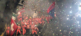Na foto os mineiro festejam a conclusão da perduração do túnel.