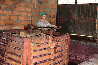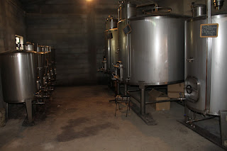No centro do lagar está colocada uma prensa com uma rosca sem fim para espremer todo o sumo, sendo depois bombeado para cubas de inox.