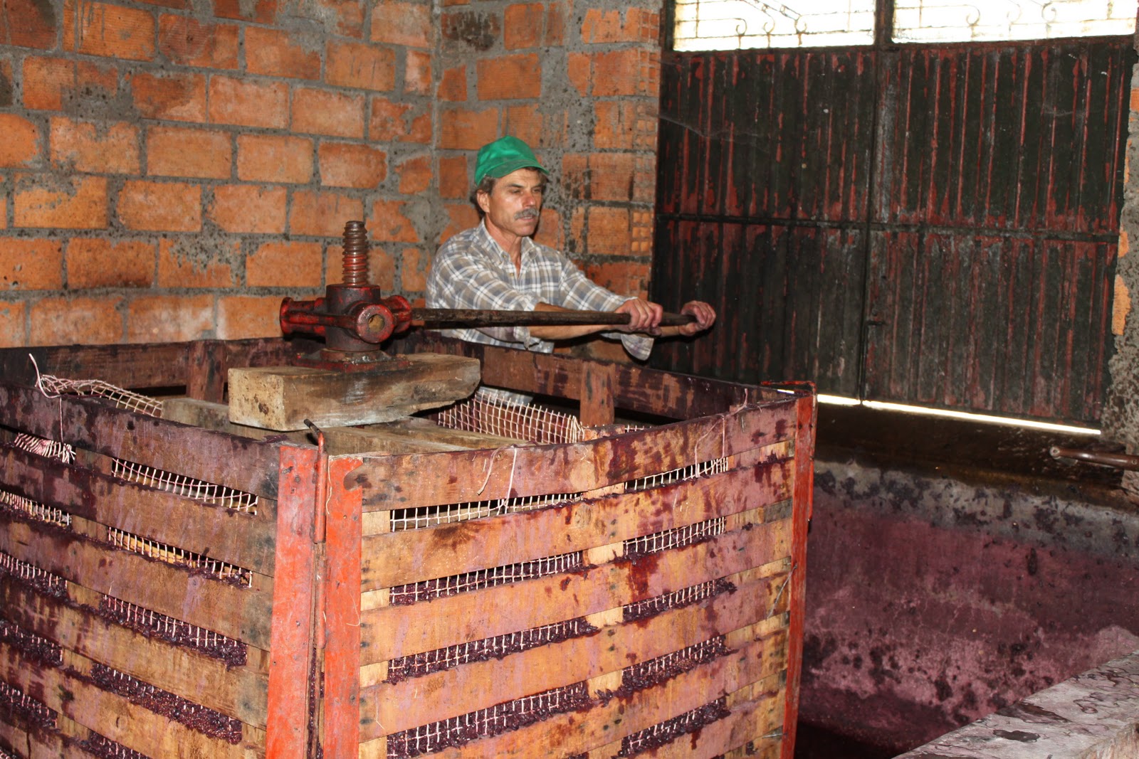 Depois do corte das uvas seguem para o lagar onde se realiza o processo, despejando as uvas no desengaçador / esmagador, separando o cadastro dos bagos, obtendo-se uma mistura de películas no lagar. O processo segue com o “pisa a pé” certificando que quanto mais taninos se transferirem da película, mais "tinto" o vinho fica, continuando o pisa a pé durante a fermentação fazendo-se baixar a manta.