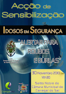 Proximo dia 30 de Novembro de 2010 o Salão Nobre da Câmara Municipal de Caregal do Sal recebe o Destacamento Territorial de Santa Comba Dão pelas 14:30 horas para uma acção de Sensibilização para roubos e burlas, (IDOSOS EM SEGURANÇA).