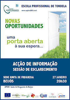 NOVAS OPORTUNIDADES - FREGUESIA DE BEIJÓS Marco 21:12 Marco Amanha pelas 20h30 na sede da Junta de Freguesia de Beijós realiza-se uma sessão de esclarecimento sobre as Novas Oportunidades, acesso a cursos profissionais e Ensino Superior. UMA PORTA ABERTA À SUA ESPERA... Tweet Partilhar Partilhar Partilhar Partilhar Artigos Relacionados