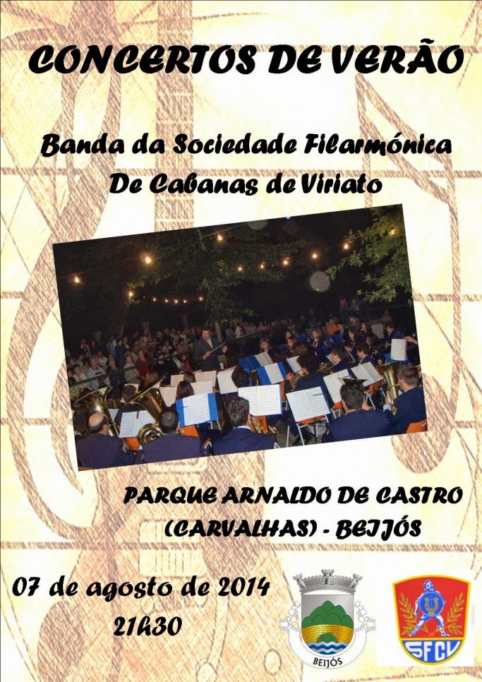CONCERTO DE VERÃO Marco 11:53 Marco Dia 7 de Agosto 2014 realiza-se no parque Arnaldo Castro em Beijós o concerto de verão com a actuação da banda Filarmónica de Cabanas de Viriato pelas 21:30. Tweet Partilhar Partilhar Partilhar Partilhar Artigos Relacionados